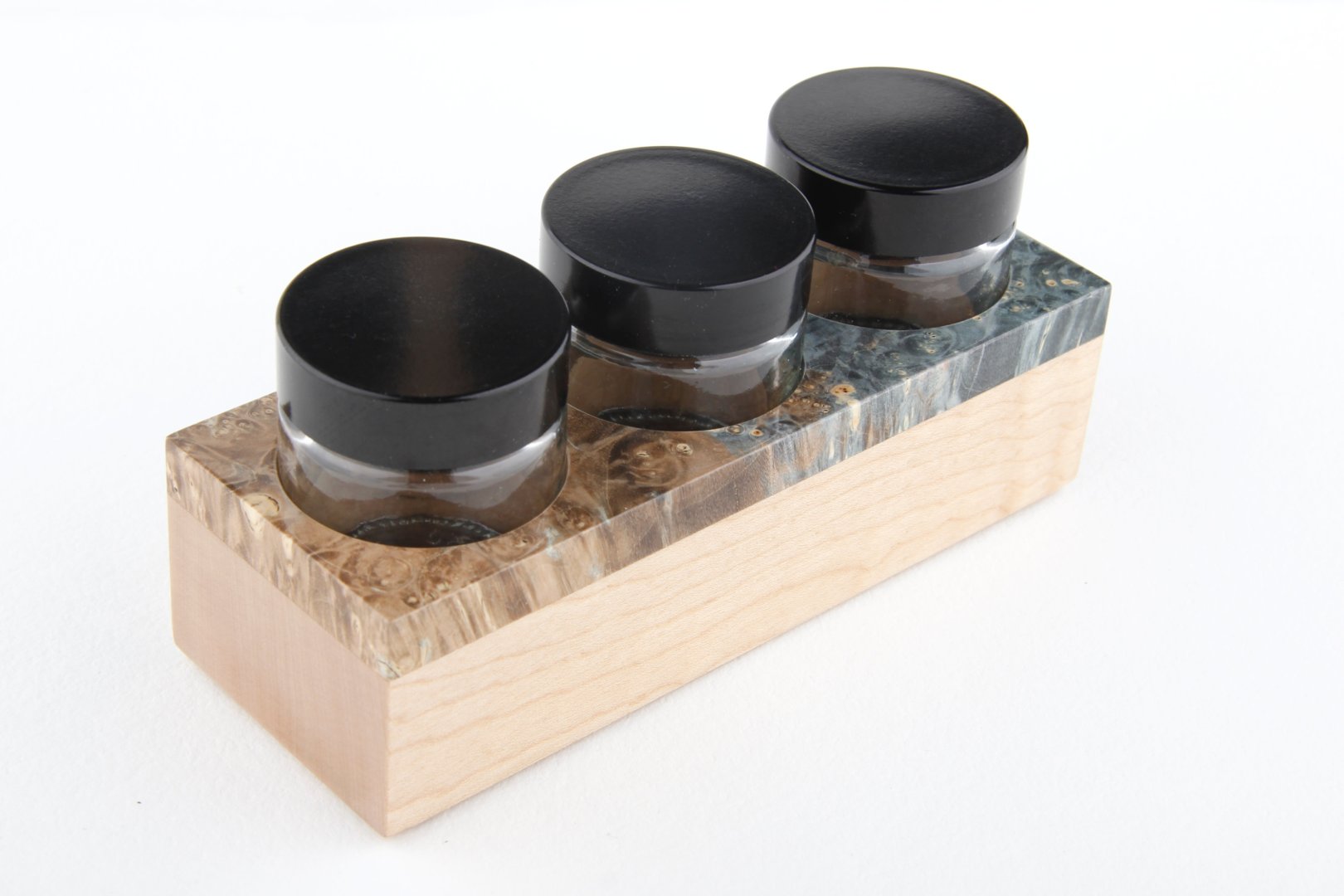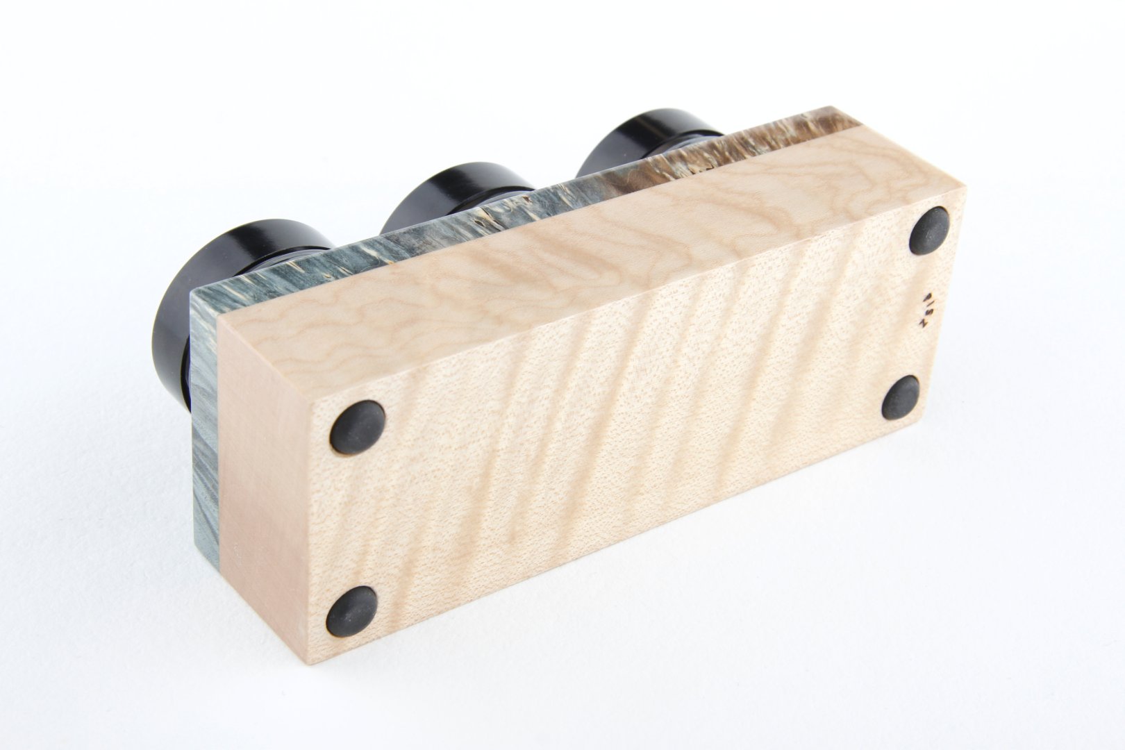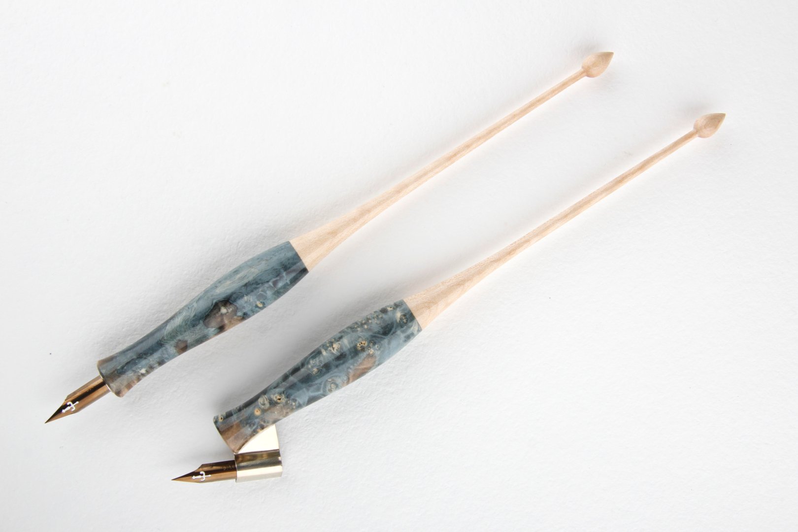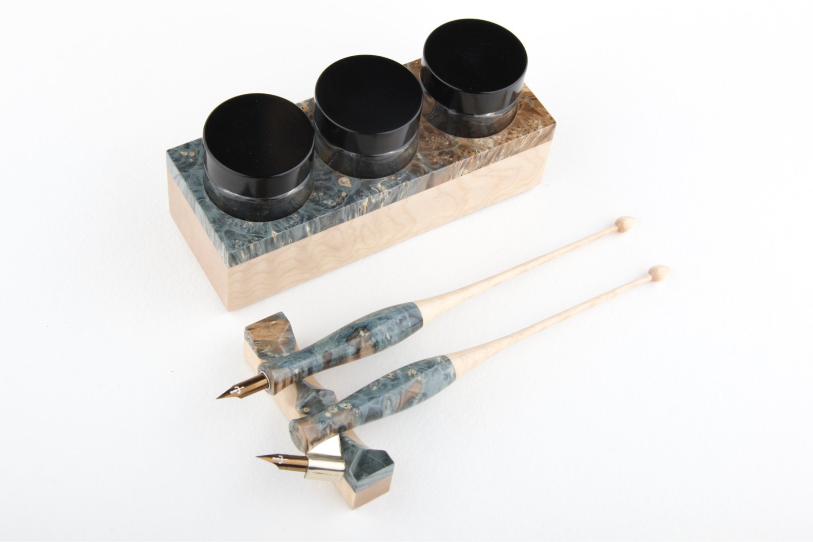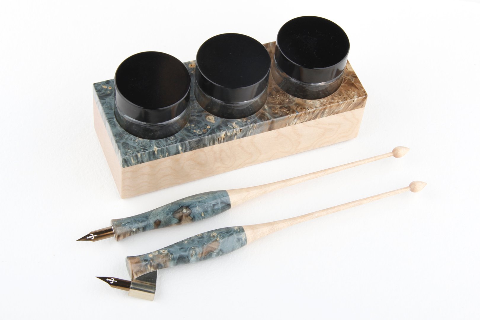 Calligraphy set made of stabilized maple burl and curly maple wood.