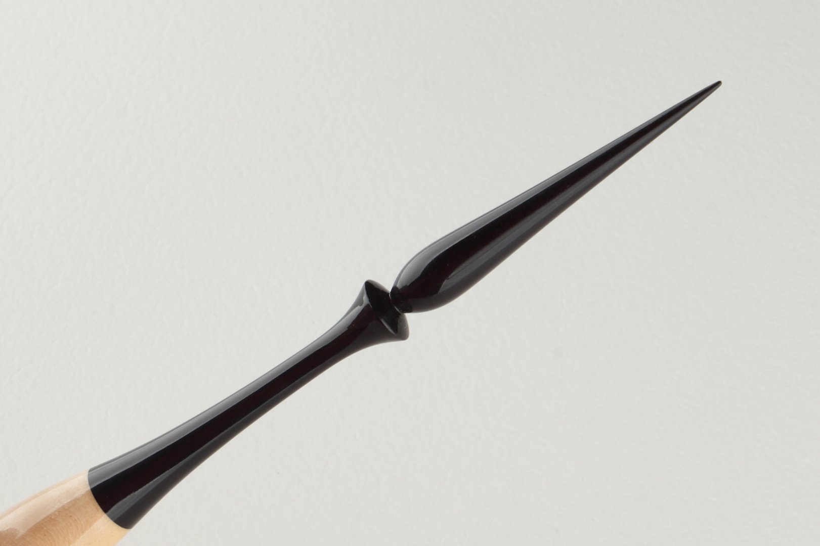 Pen holder made of gabon ebony and curly maple wood. Finished with gloss clear coat. Equipped with nib ferrule made of stainless steel.