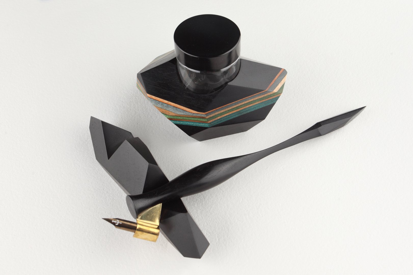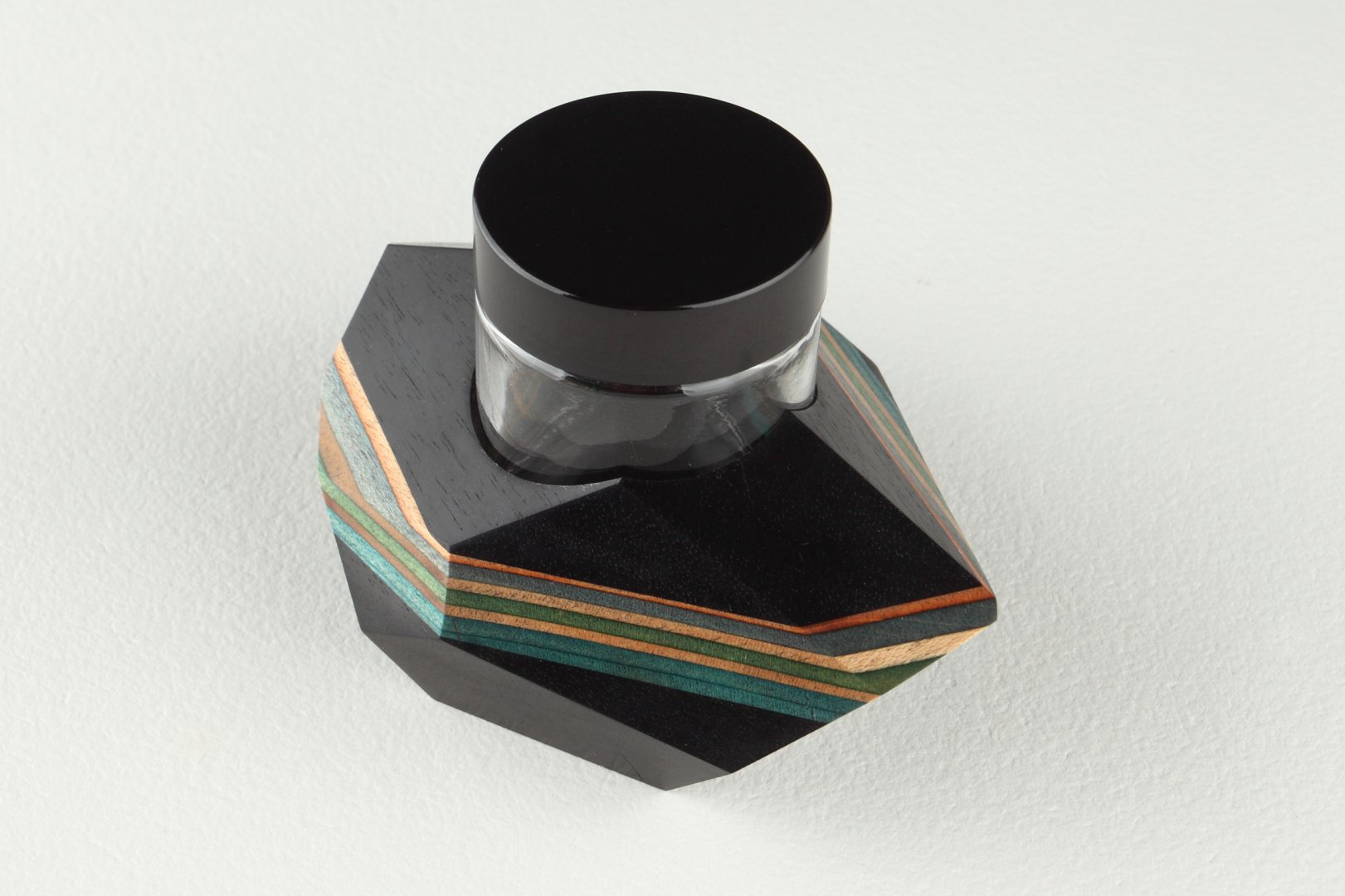 Inkwell made of gabon ebony with an inset made of broken skateboard :) Finished with natural oil and wax and equipped with 30 ml ink jar.
