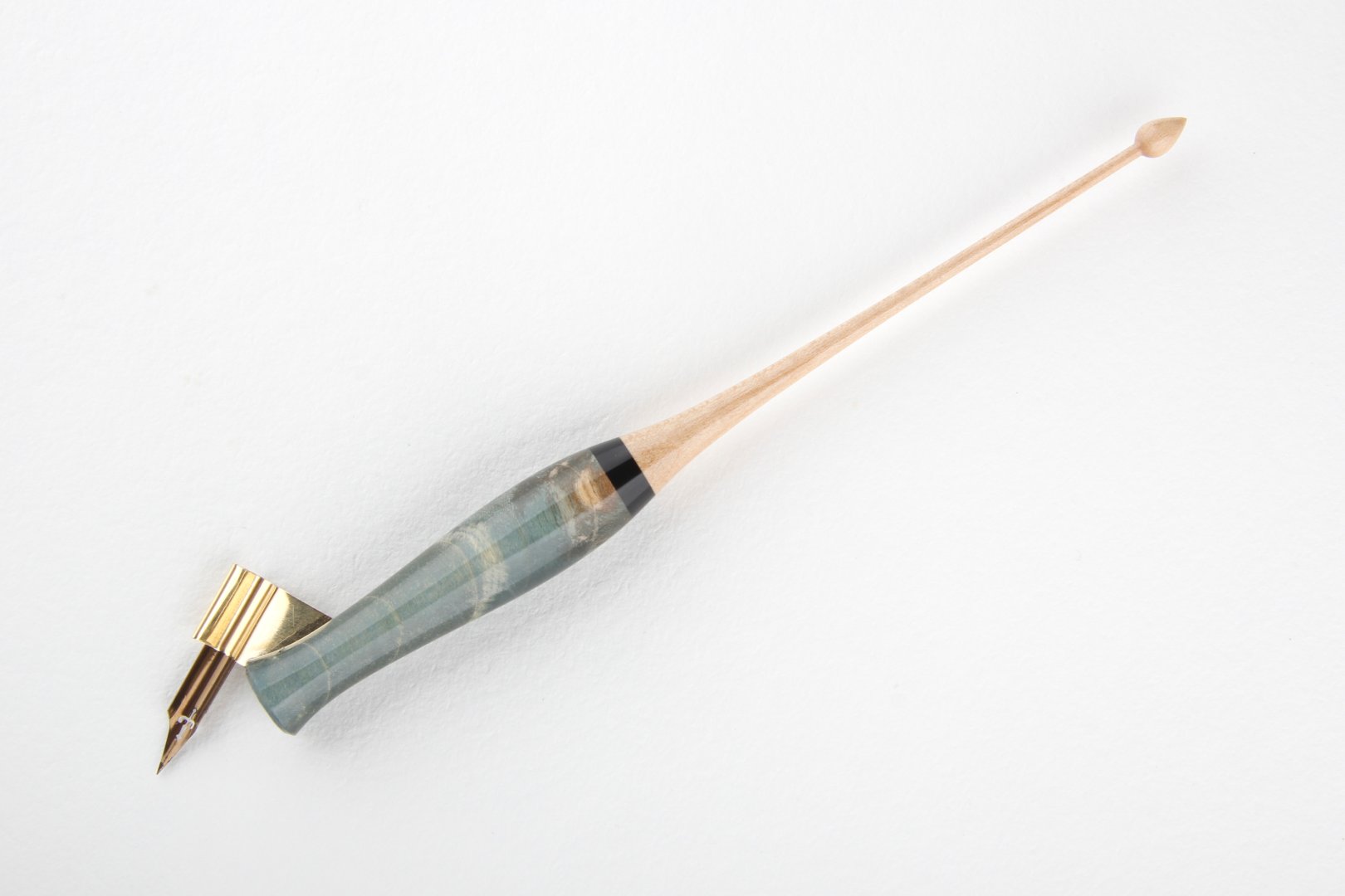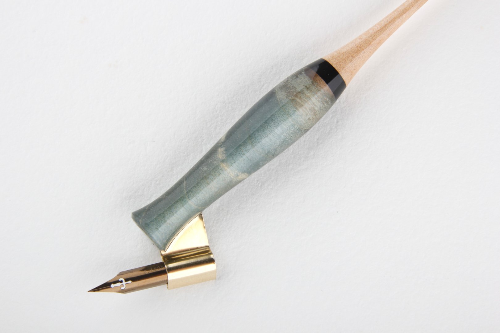 Oblique pen holder made of stabilized maple burl, african ebony and curly maple wood. Finished with 10 layers clear coat polished to a high gloss.