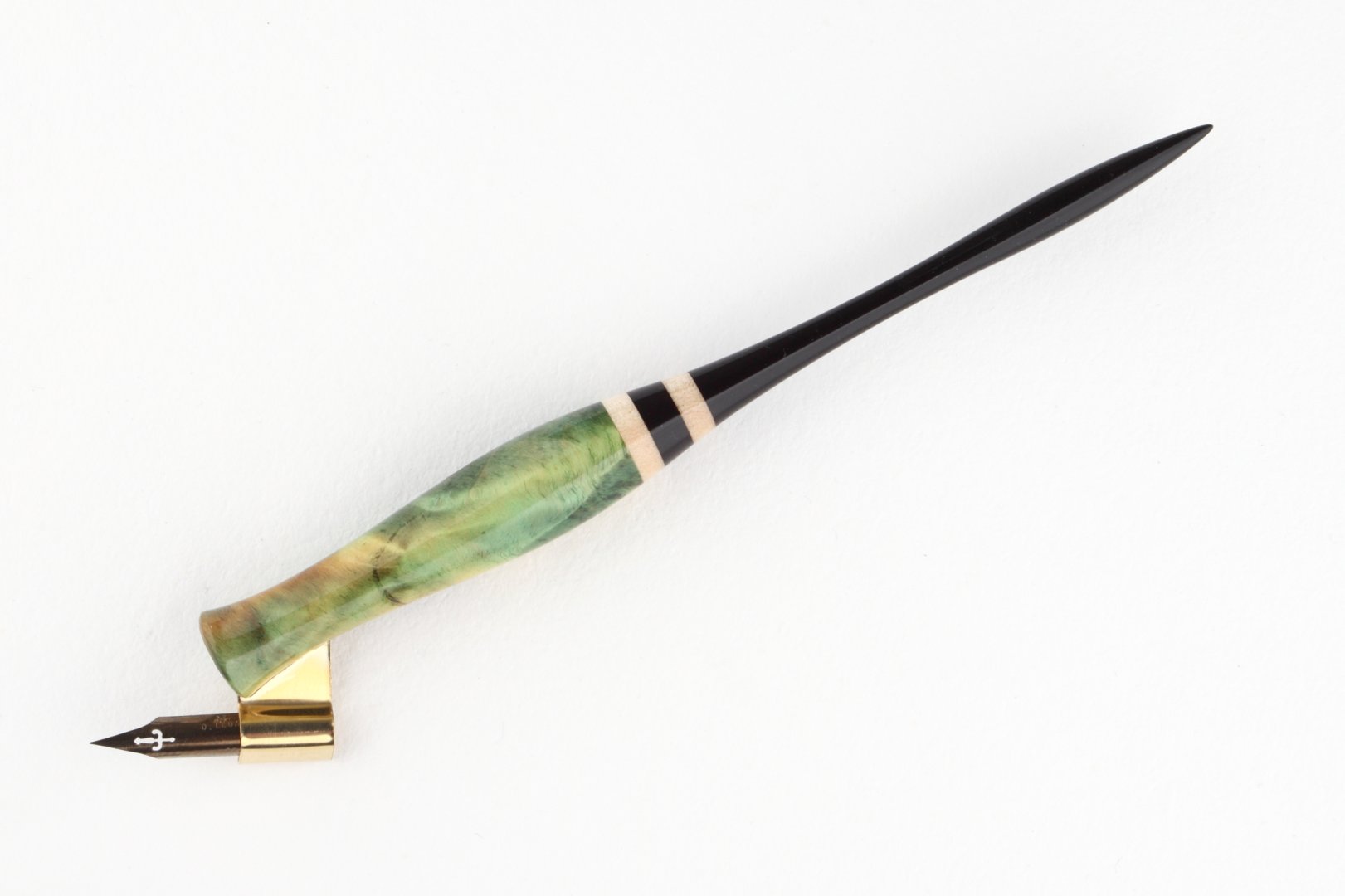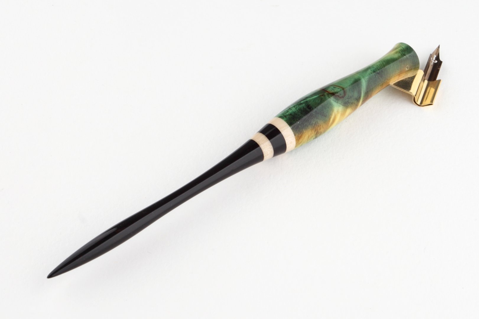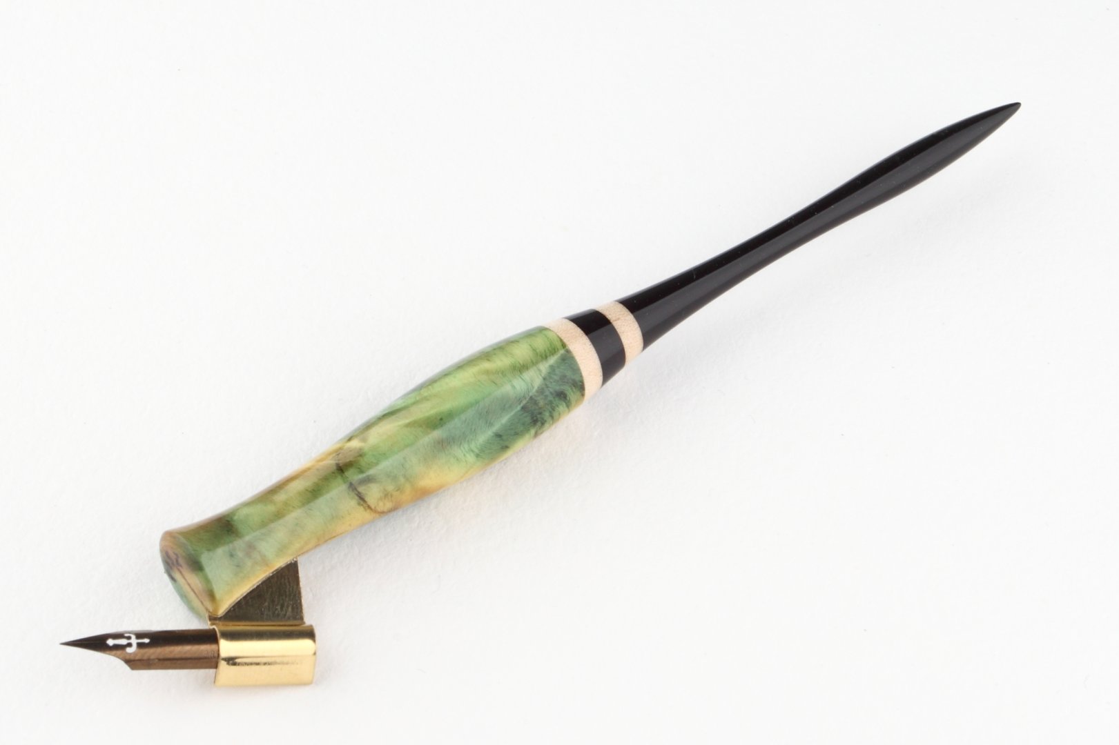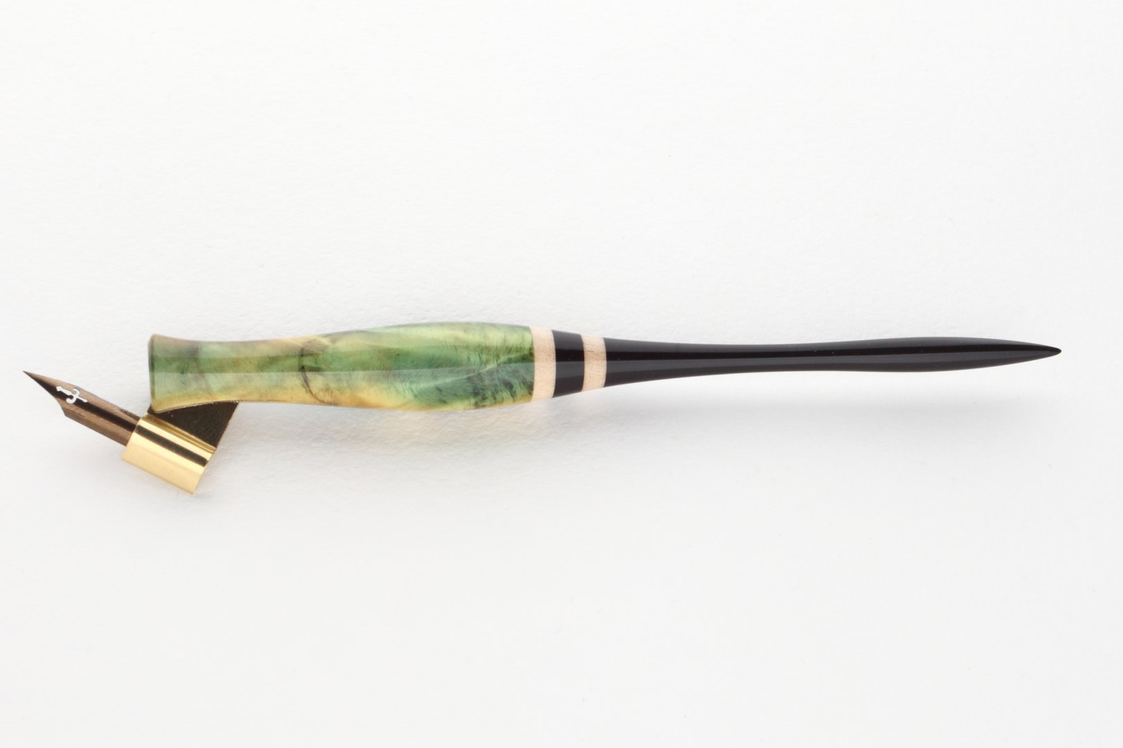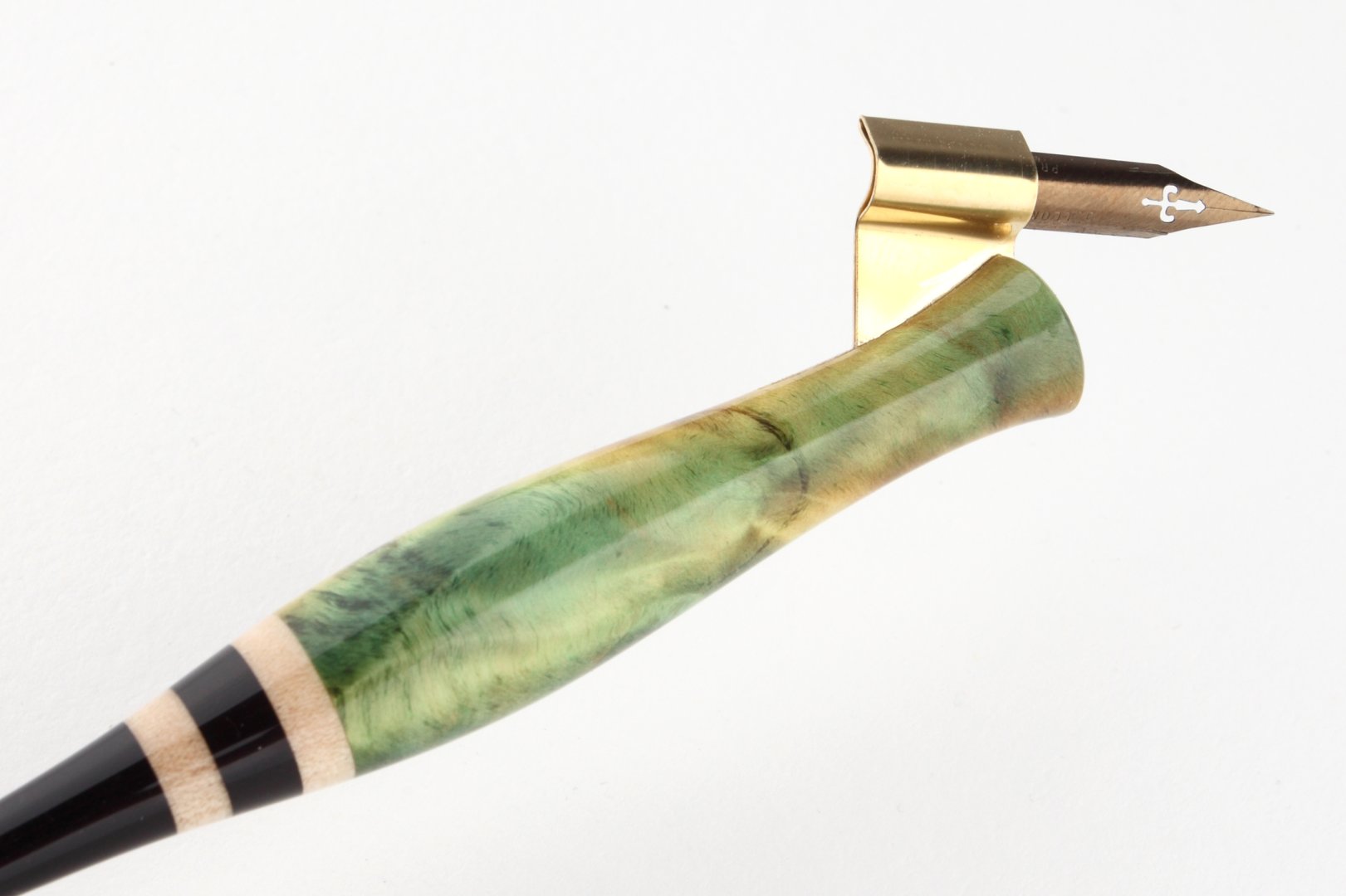 Oblique pen holder made of stabilized birch burl and african ebony, insets are made of curly maple wood.