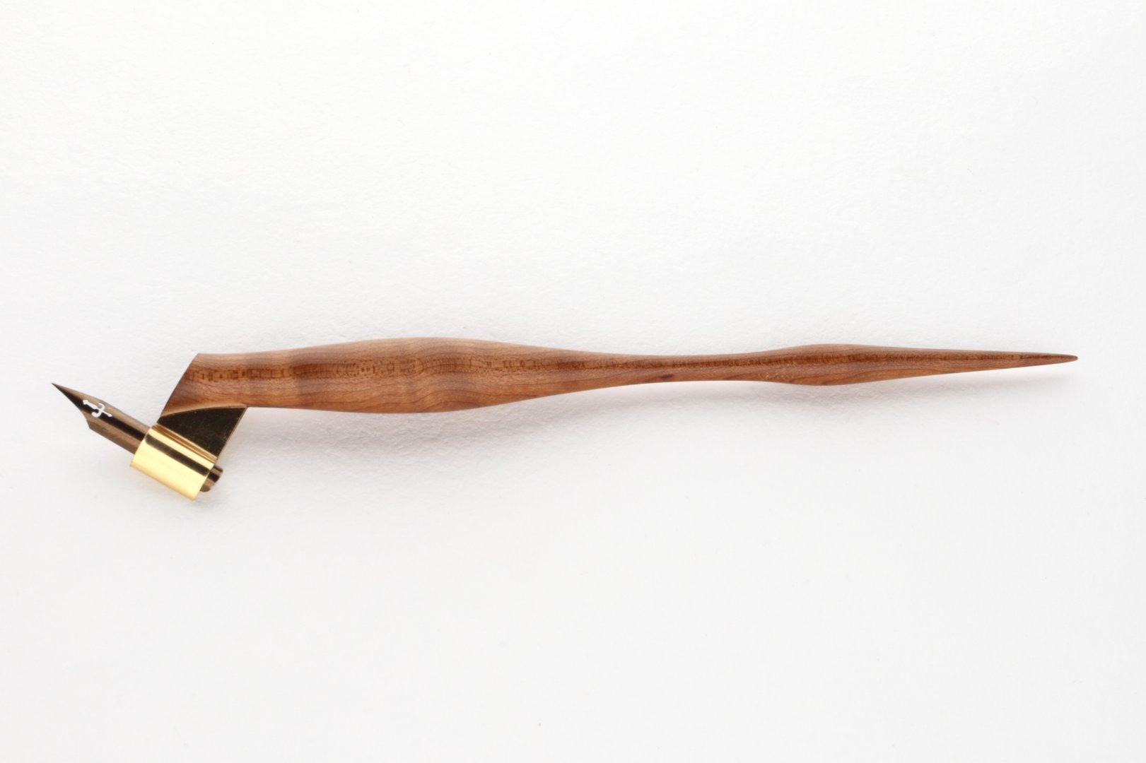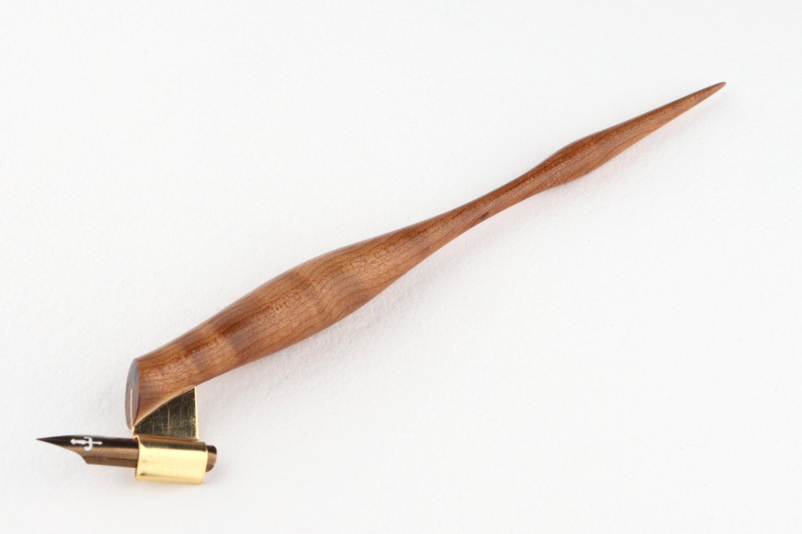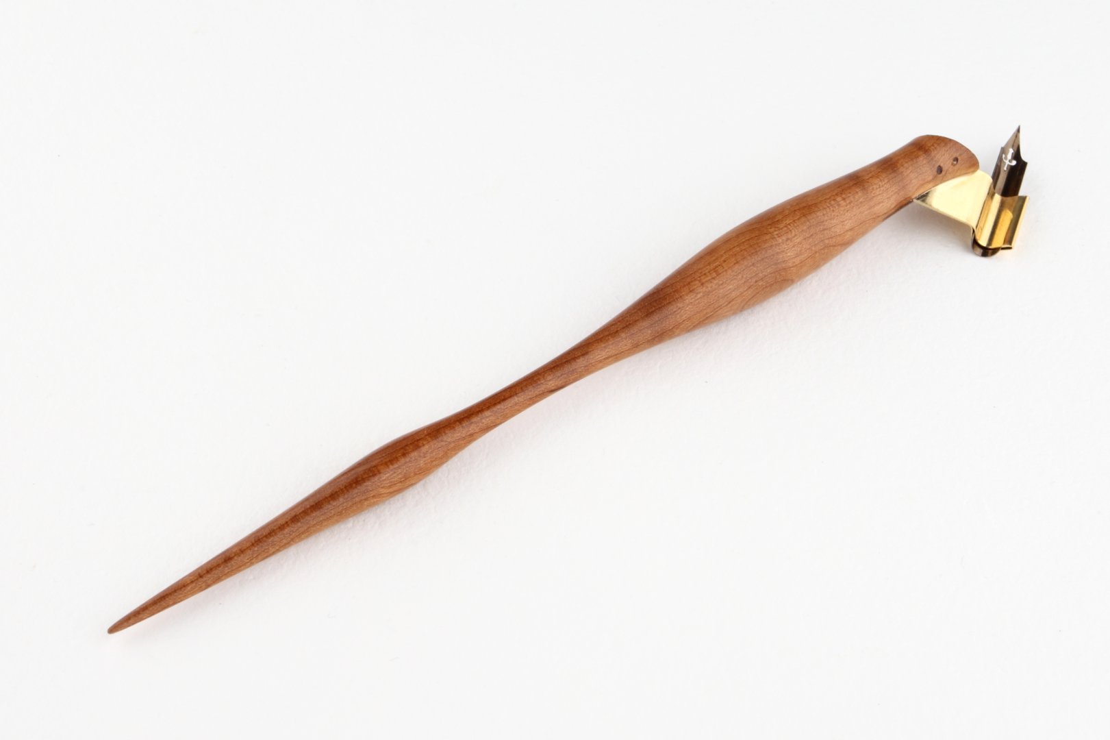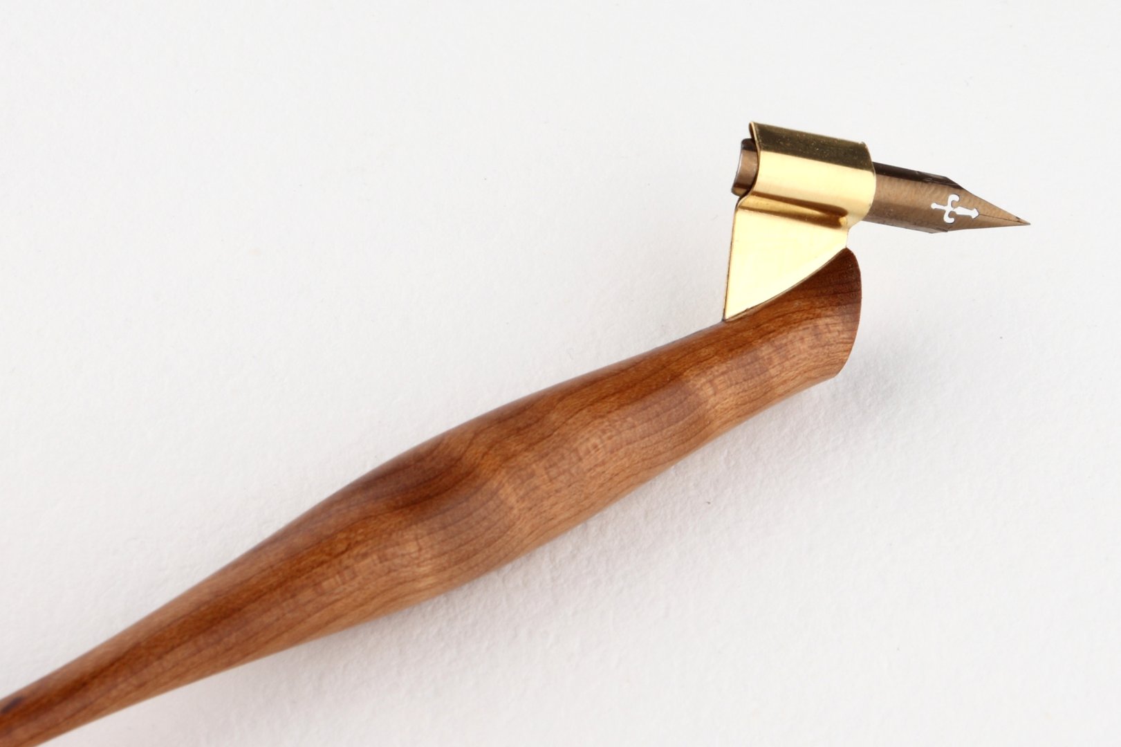 Oblique pen holder made of steamed curly american cherry and finished with natural wax.