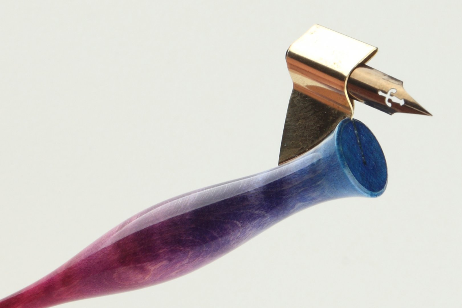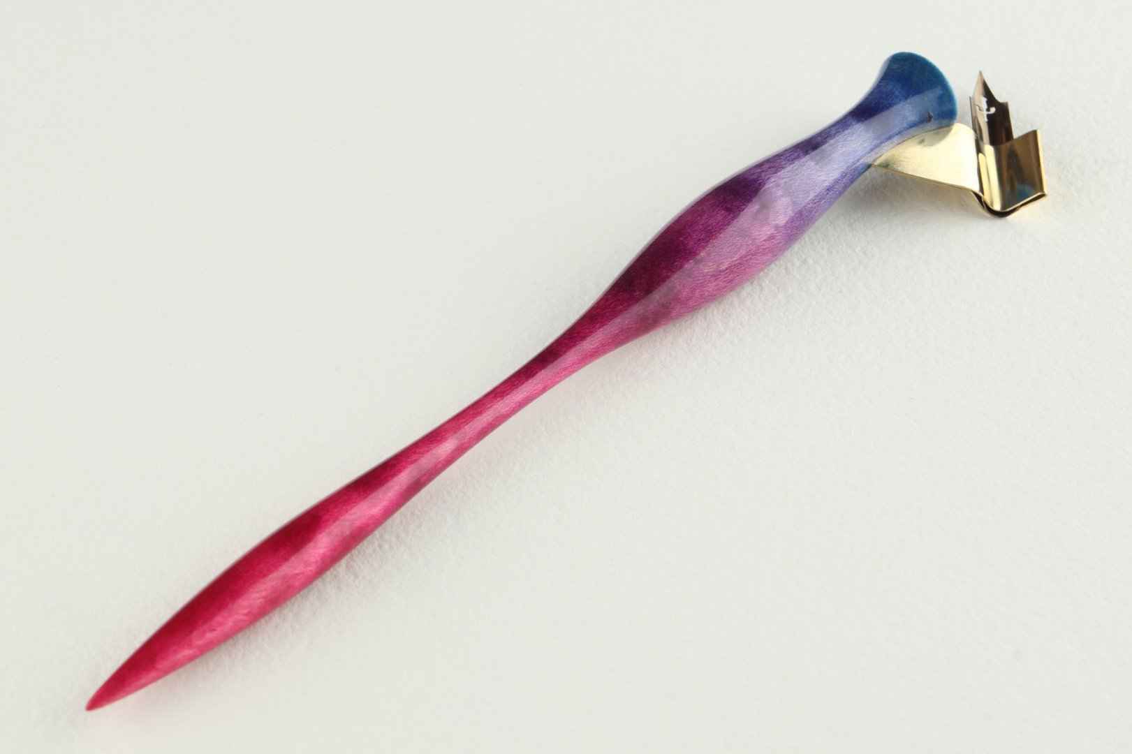 Pen holder made of dyed curly maple wood. Finished with gloss clear coat. Flange is made of brass.