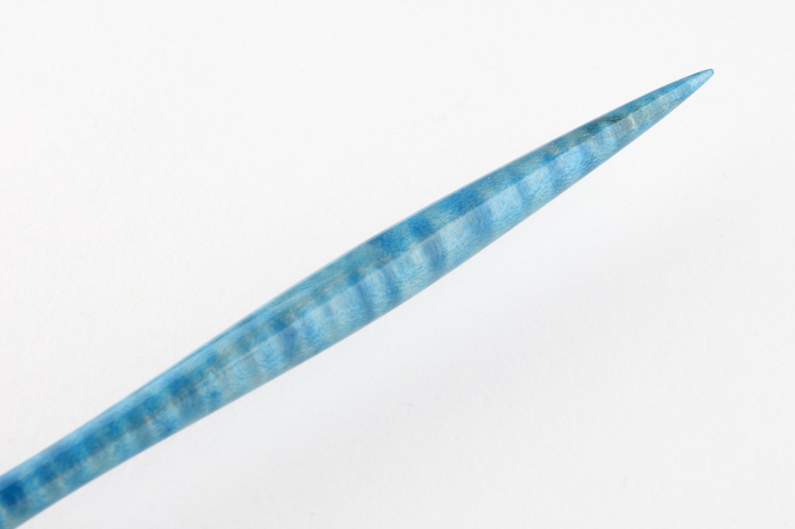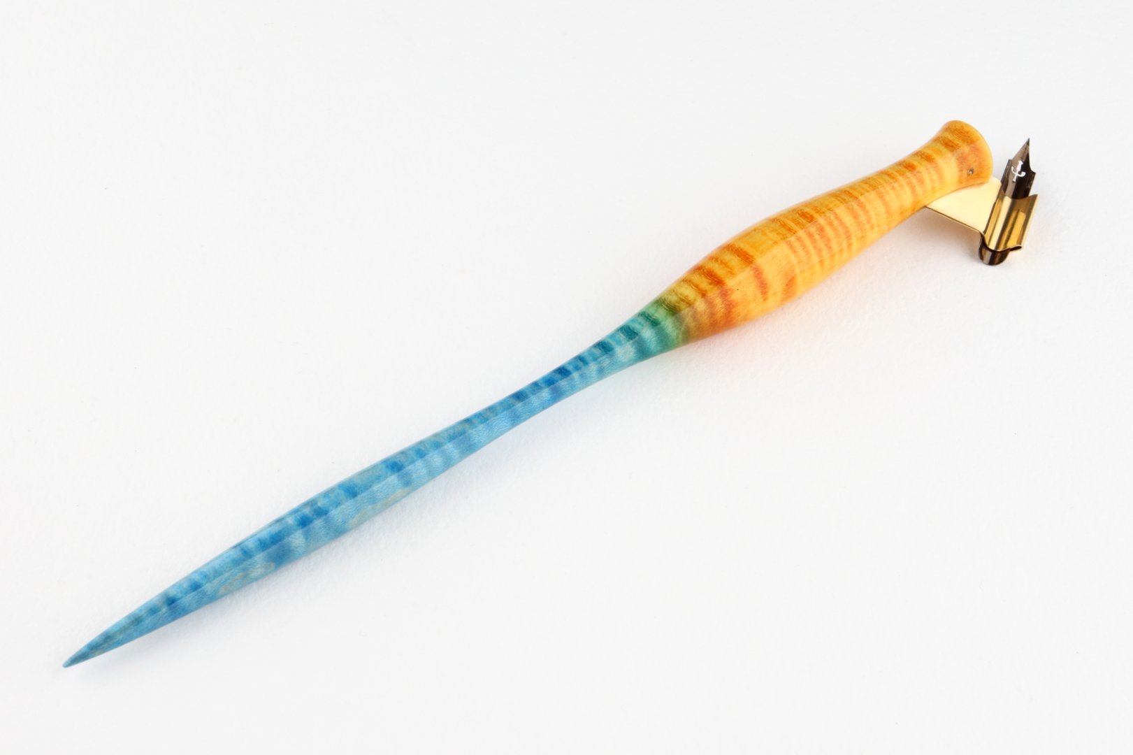Pen holder made of dyed curly maple, finished with 10 layers clear coat polished to a high gloss.