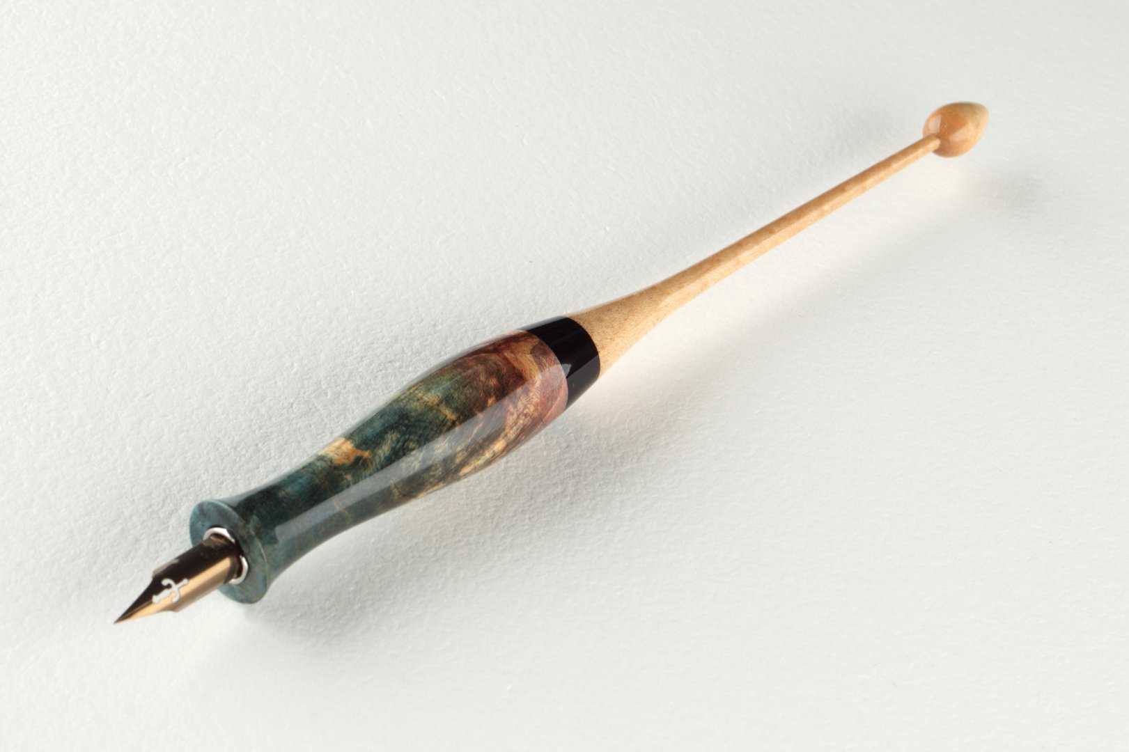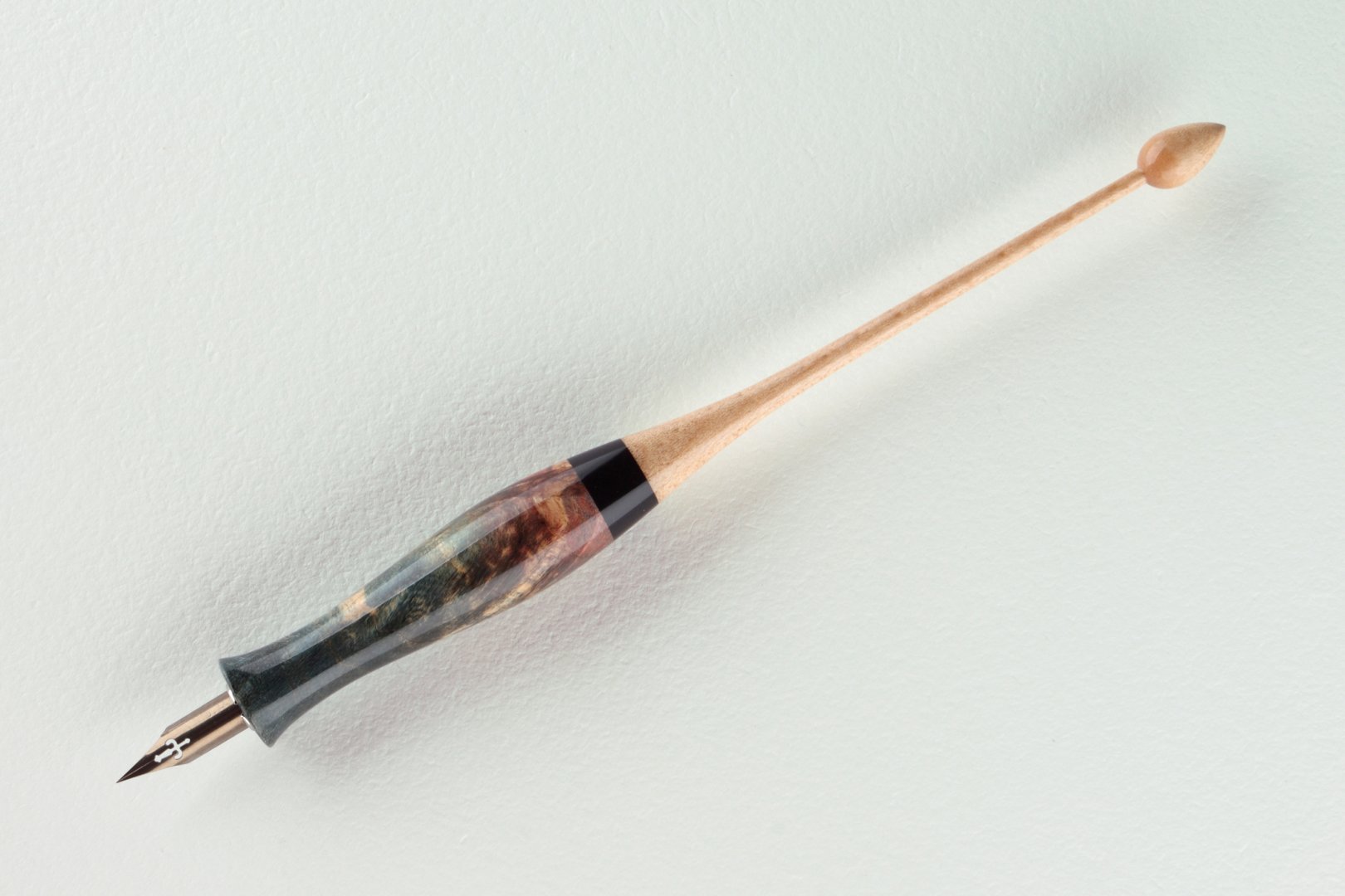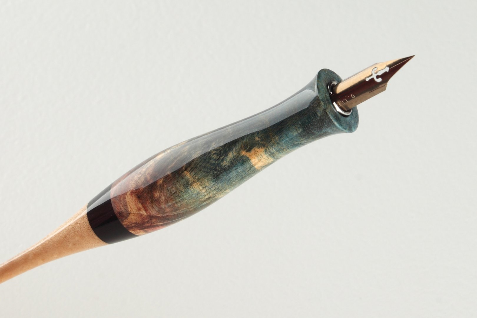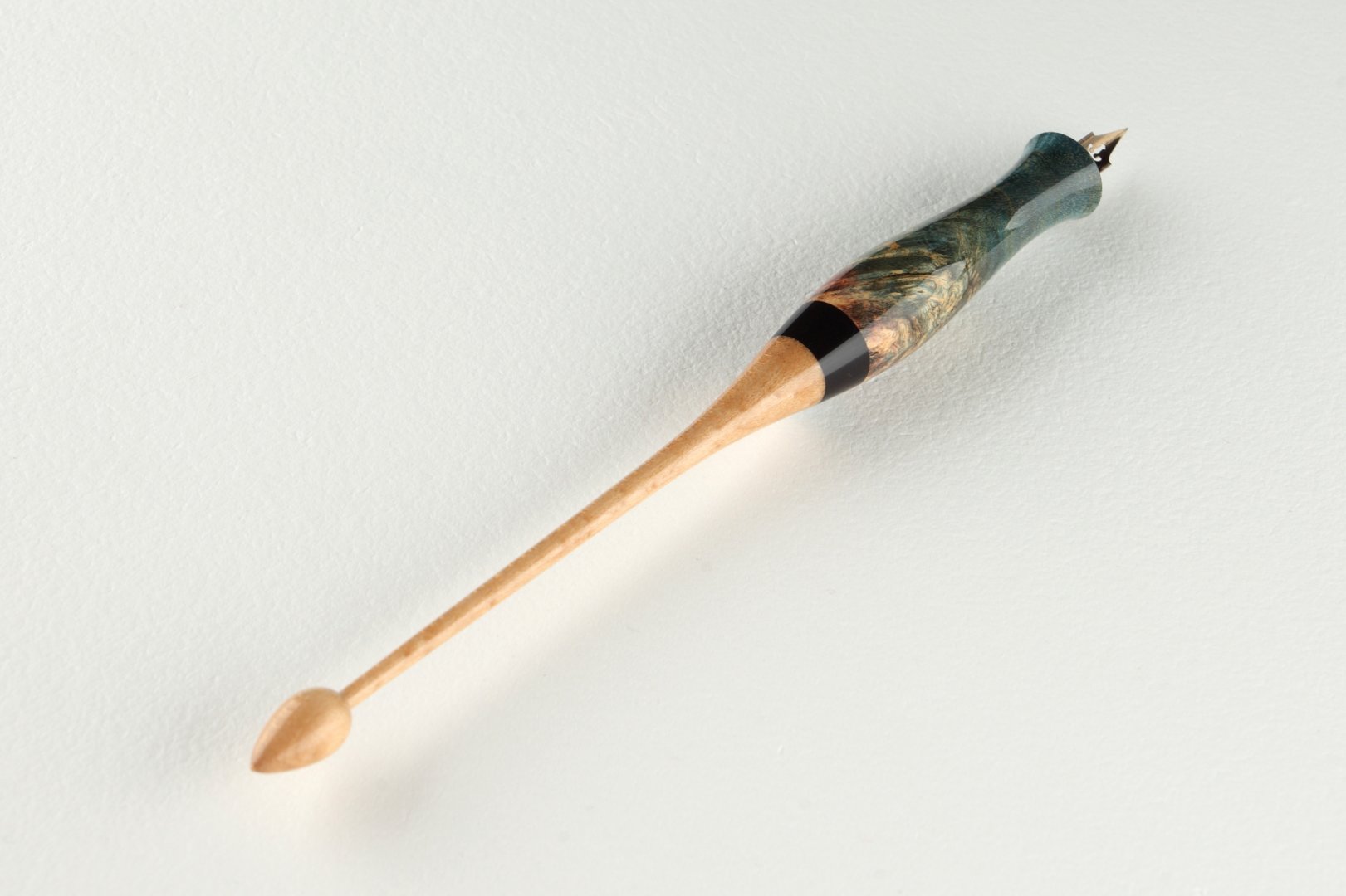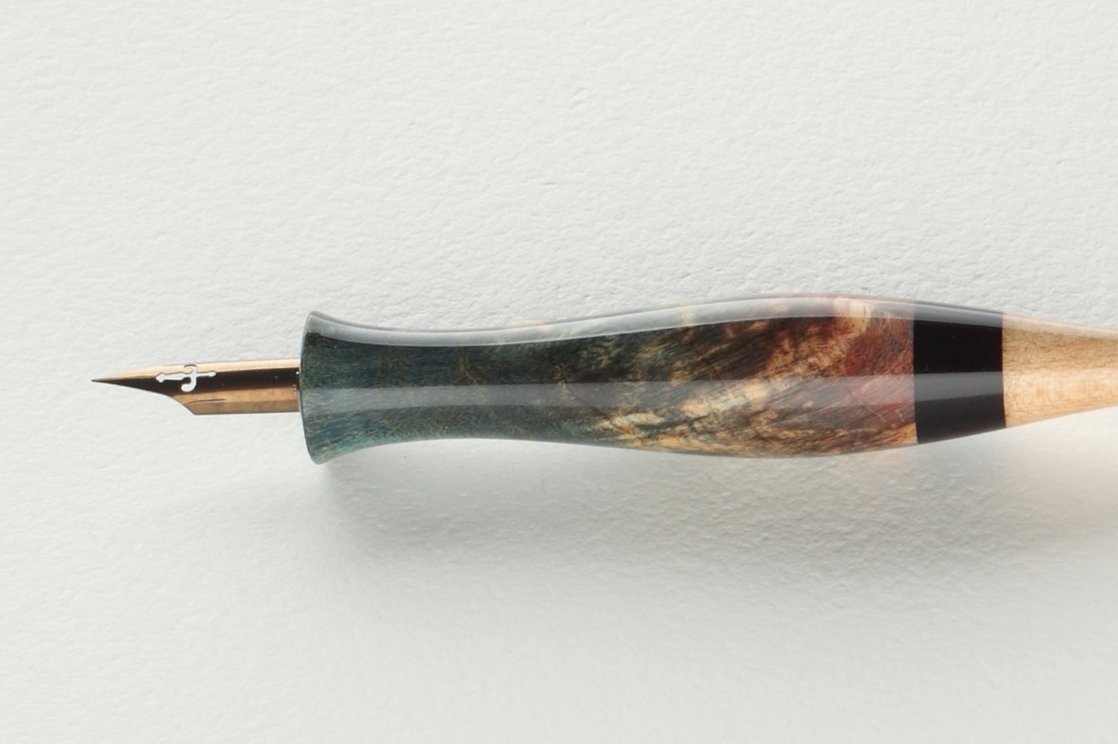 Pen holder made of stabilized maple burl and curly maple wood. Finished with gloss clear coat. Equipped with nib ferrule made of stainless steel.