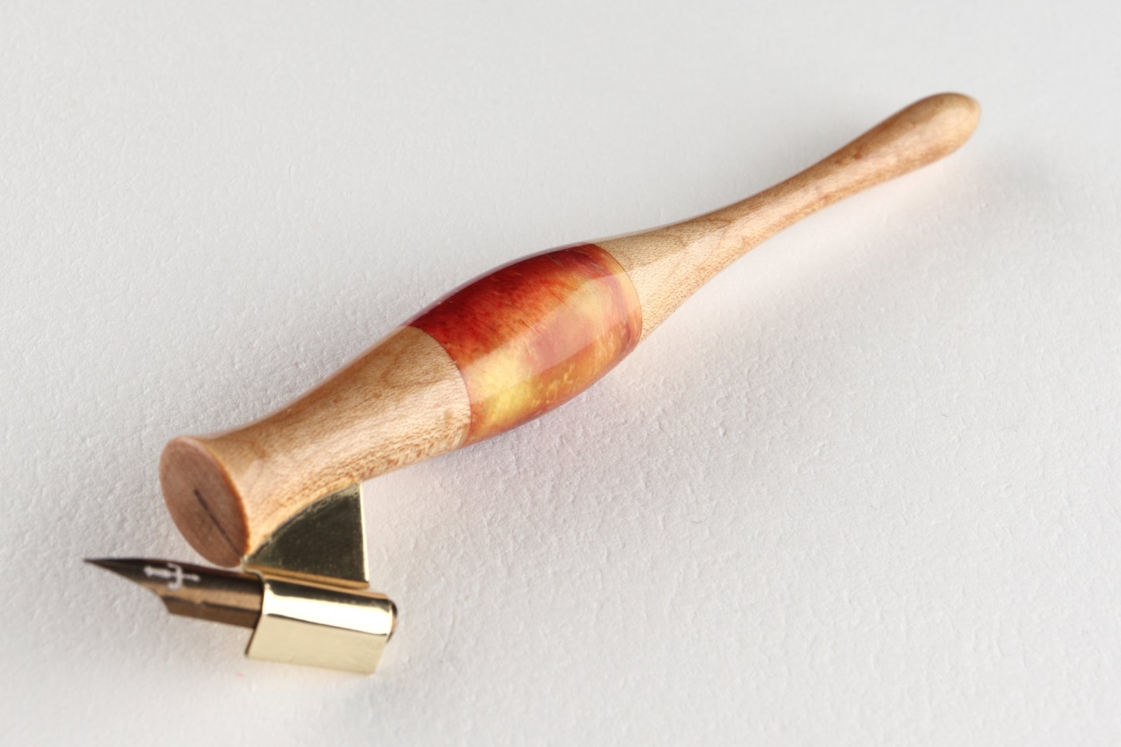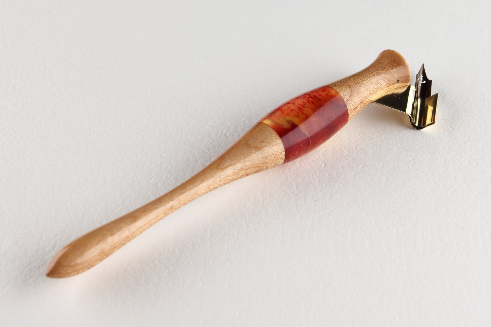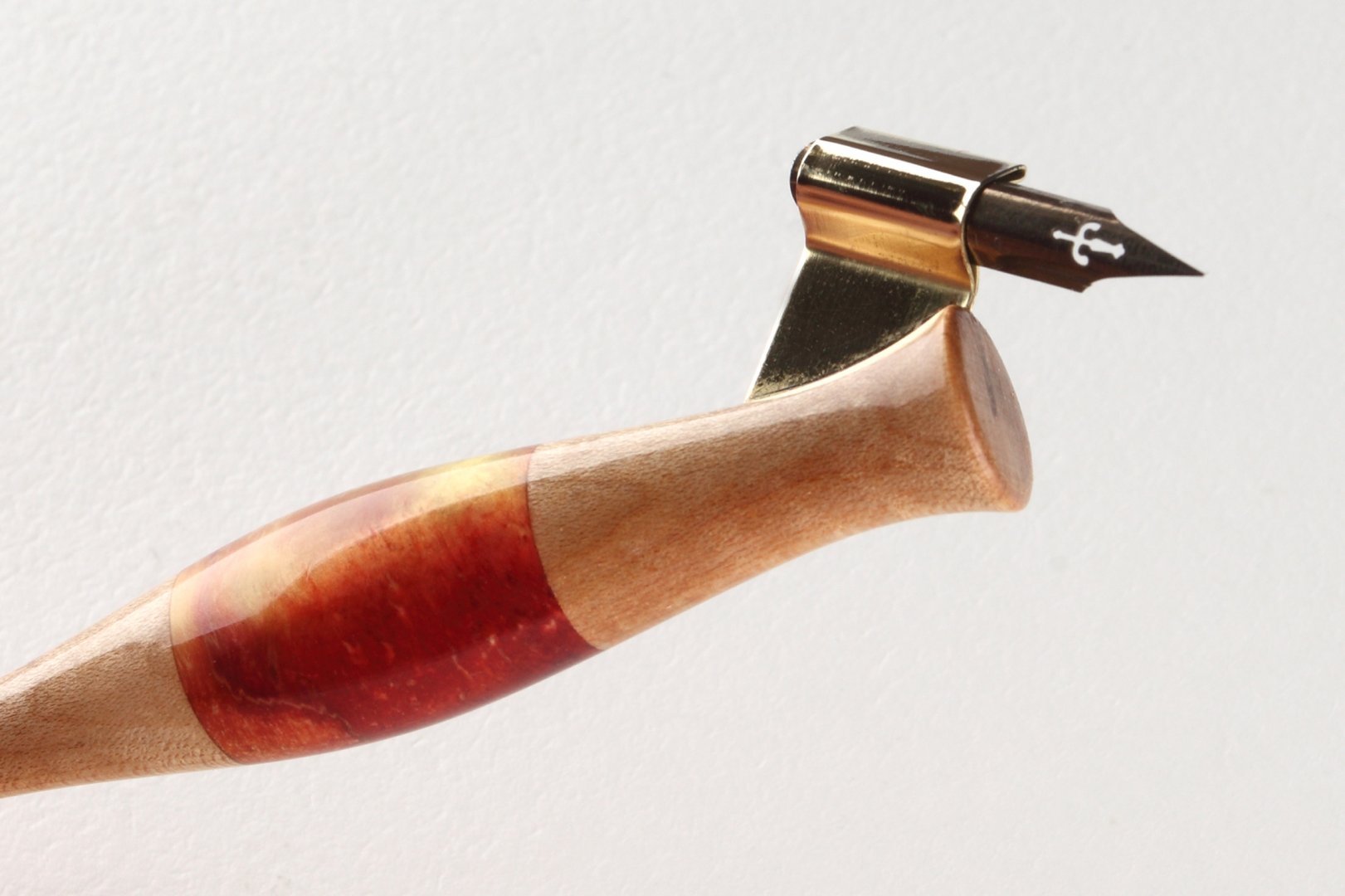 Pen holder made of stabilized birch burl and pear wood. Finished with gloss clear coat. Nib flange is made of brass.