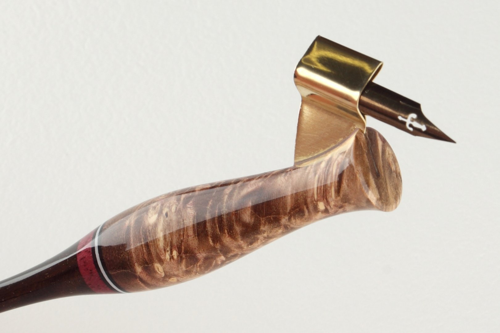 Pen holder made of stabilized burl of maple wood, 3 layers of compressed cellulose, amaranth wood and brazilian ebony wood.