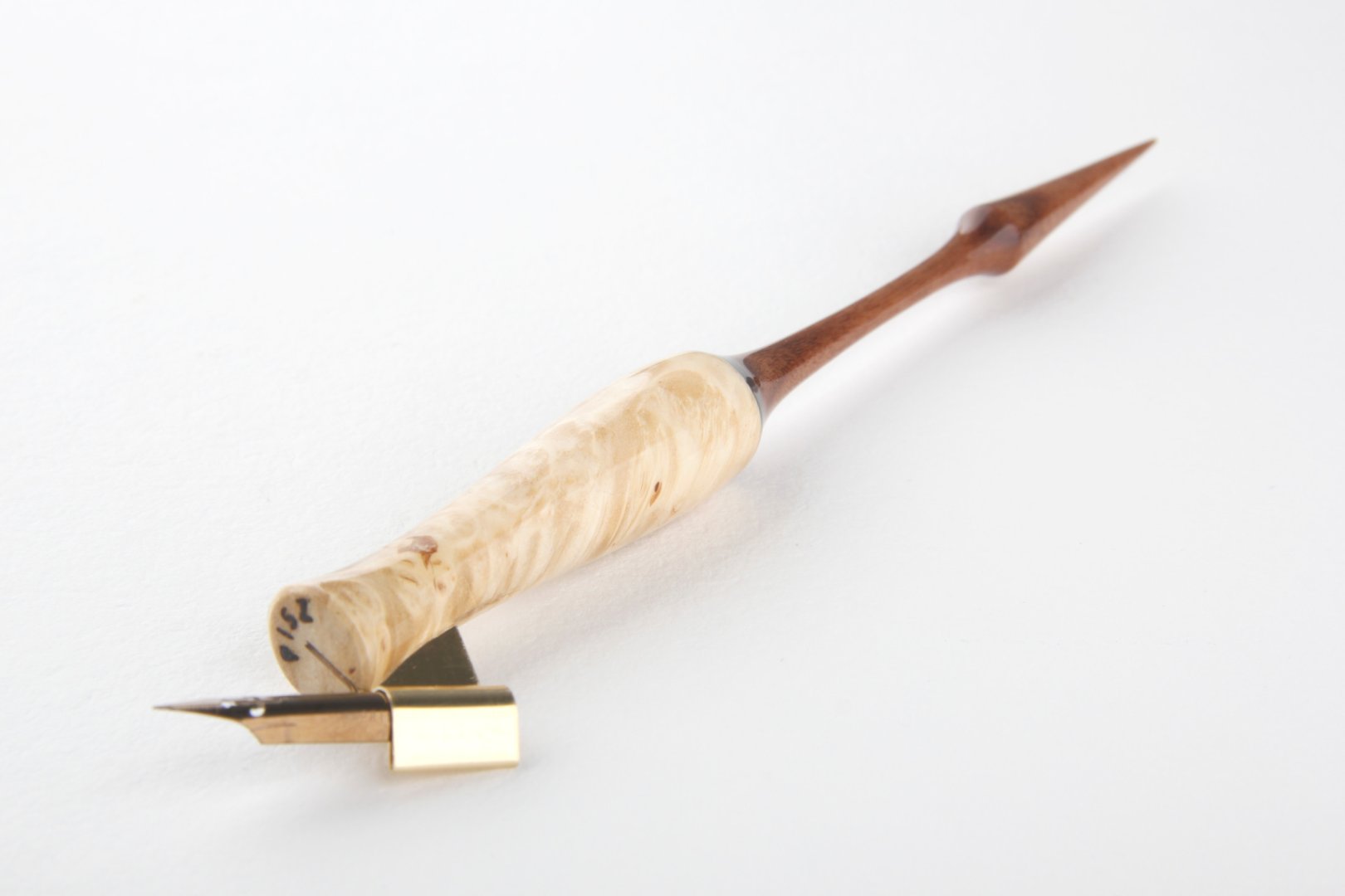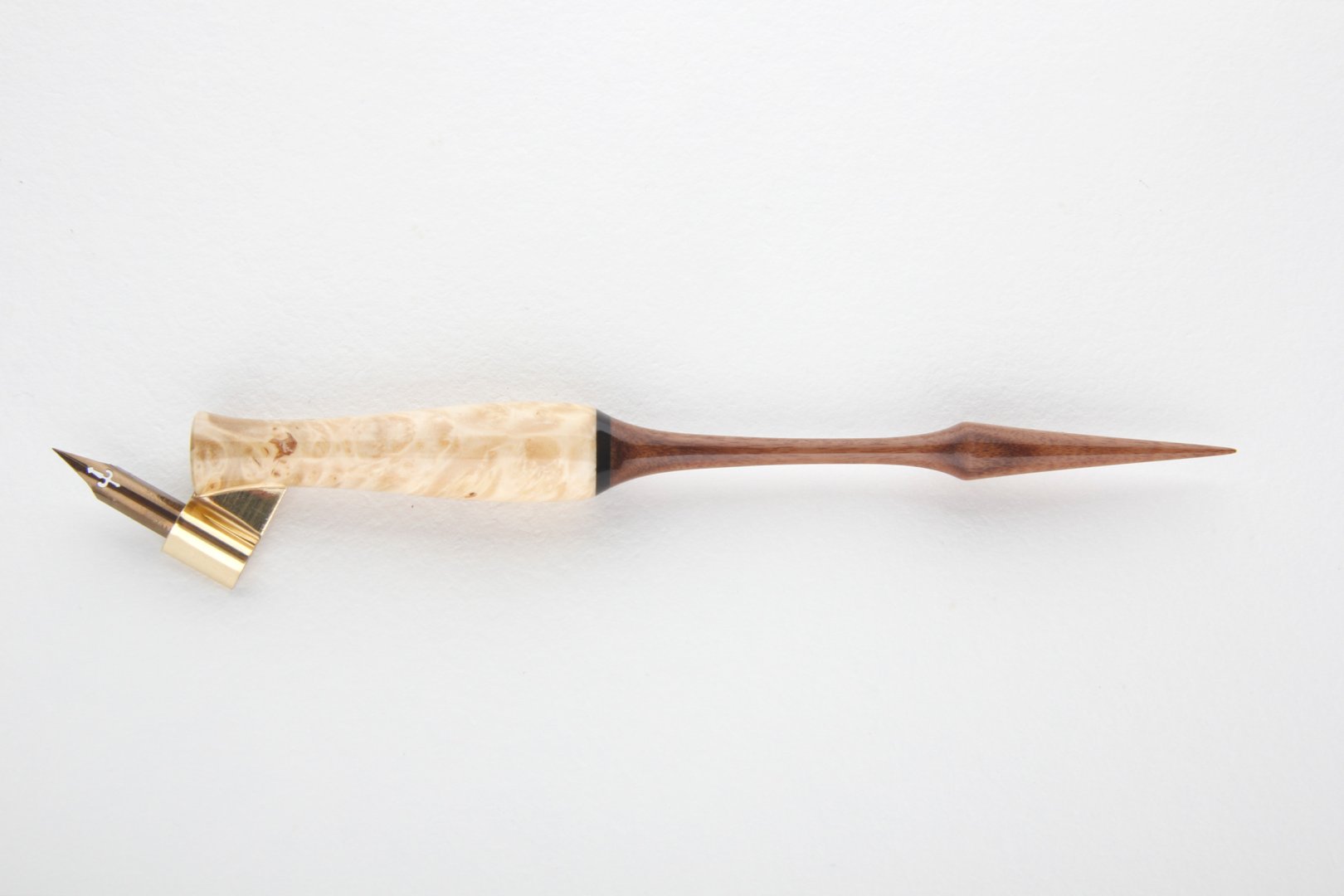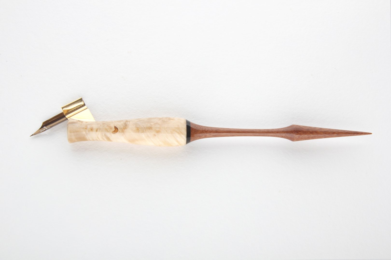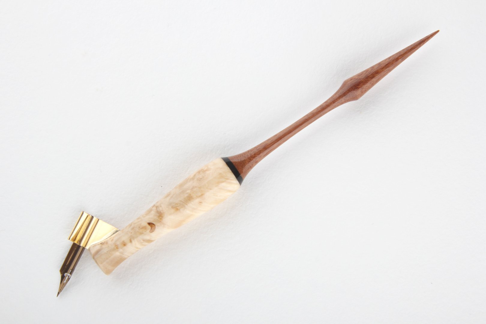 Pen holder made of stabilized maple burl, african ebony and pay ferro wood.