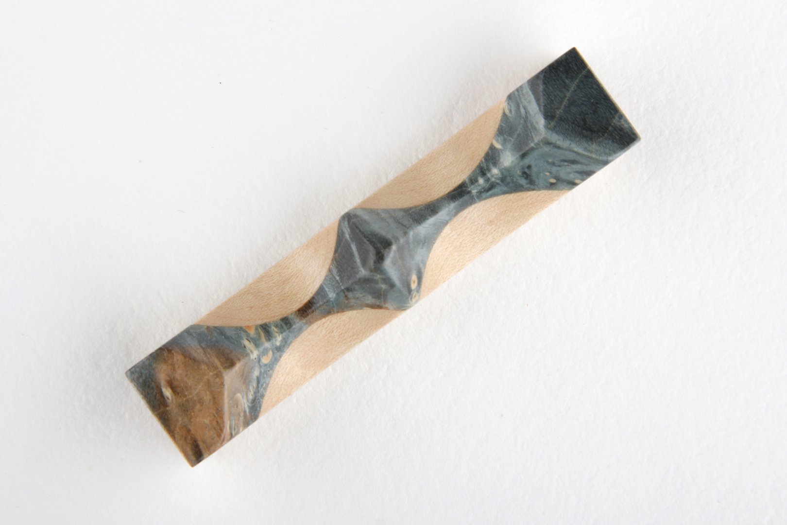 Pen rest made of stabilized maple burl and curly maple wood.