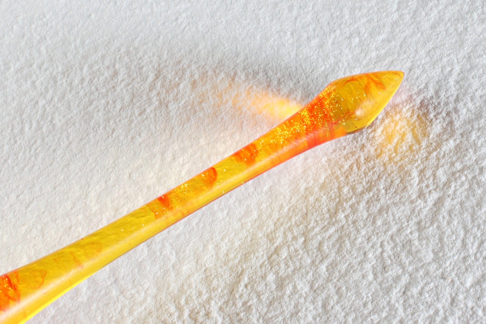 Pen holder made of the custom cast resin. Carefully polished to a high gloss. Amazing combination of yellow resin with red wisps and glinting particles, it makes gorgeous effect as you twirl the pen in the light. Nib flange is made of brass.