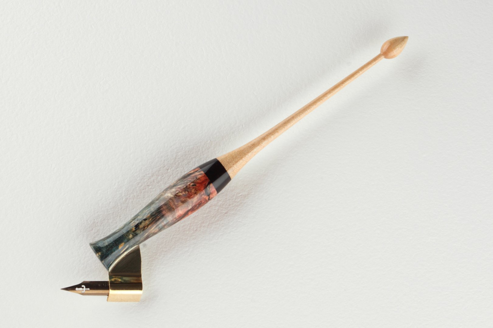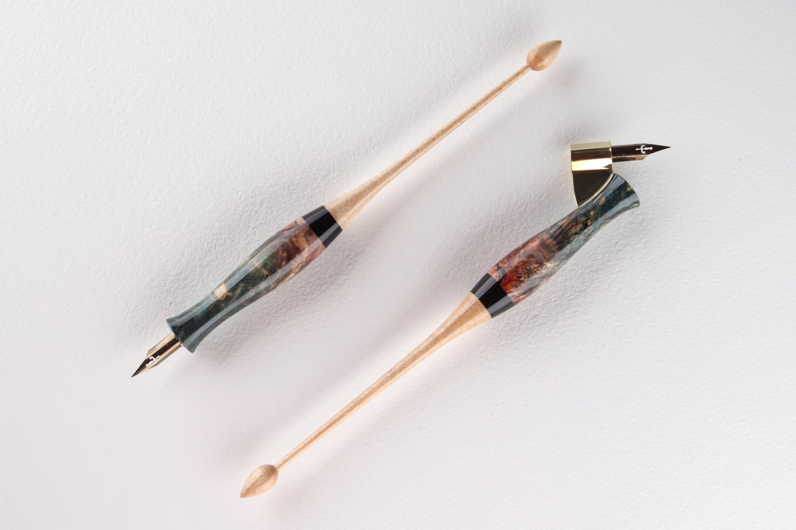Set of pen holders made of stabilized maple burl and curly maple wood. Finished with gloss clear coat. Flange in oblique holder is made of brass, in straight one is made of stainless steel.