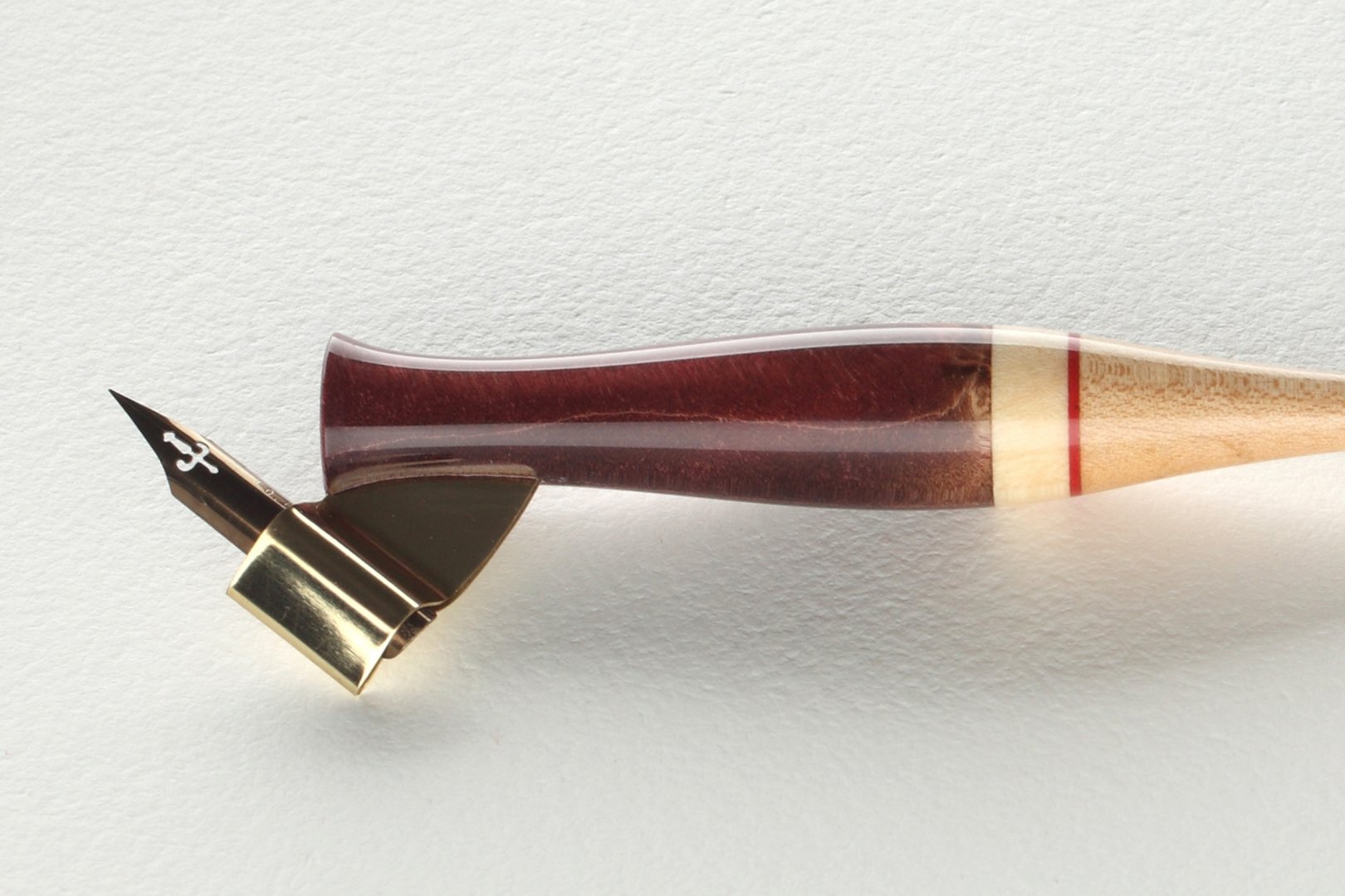 Pen holder made of stabilized burl of maple wood, curly maple wood and compressed cellulose inset.