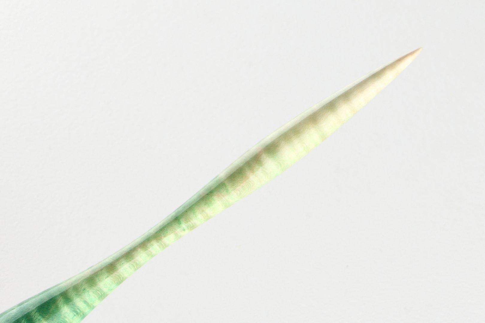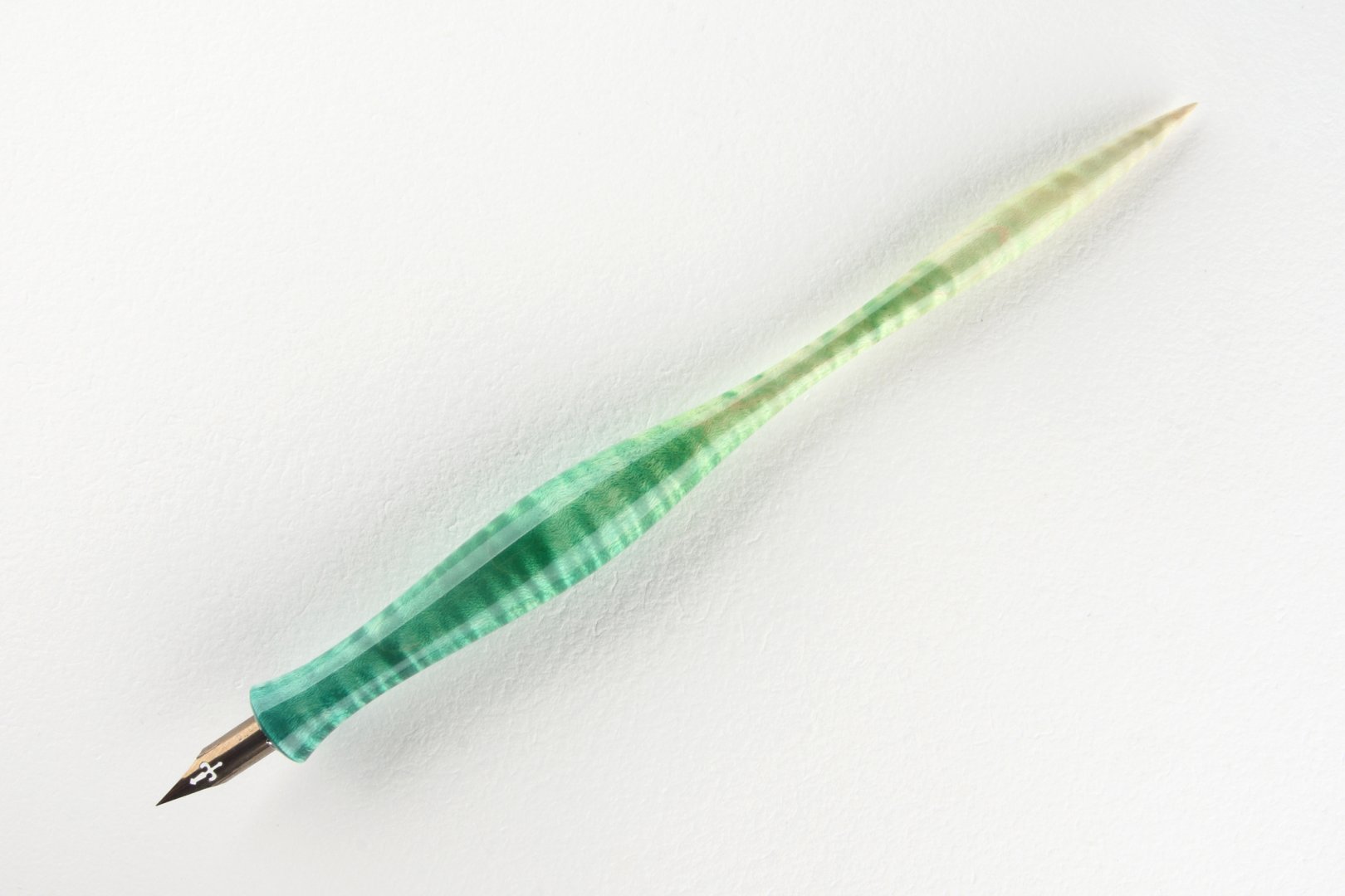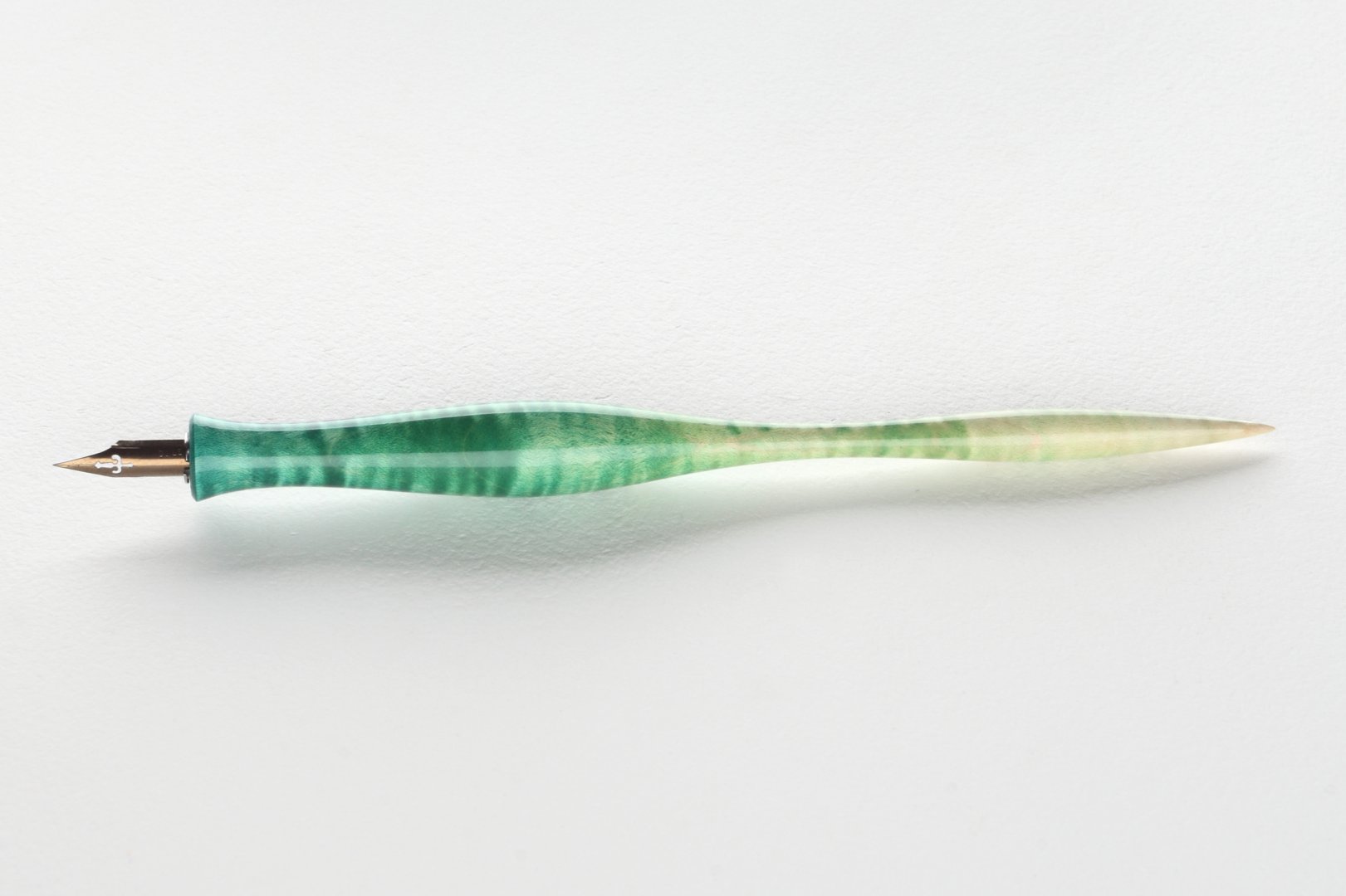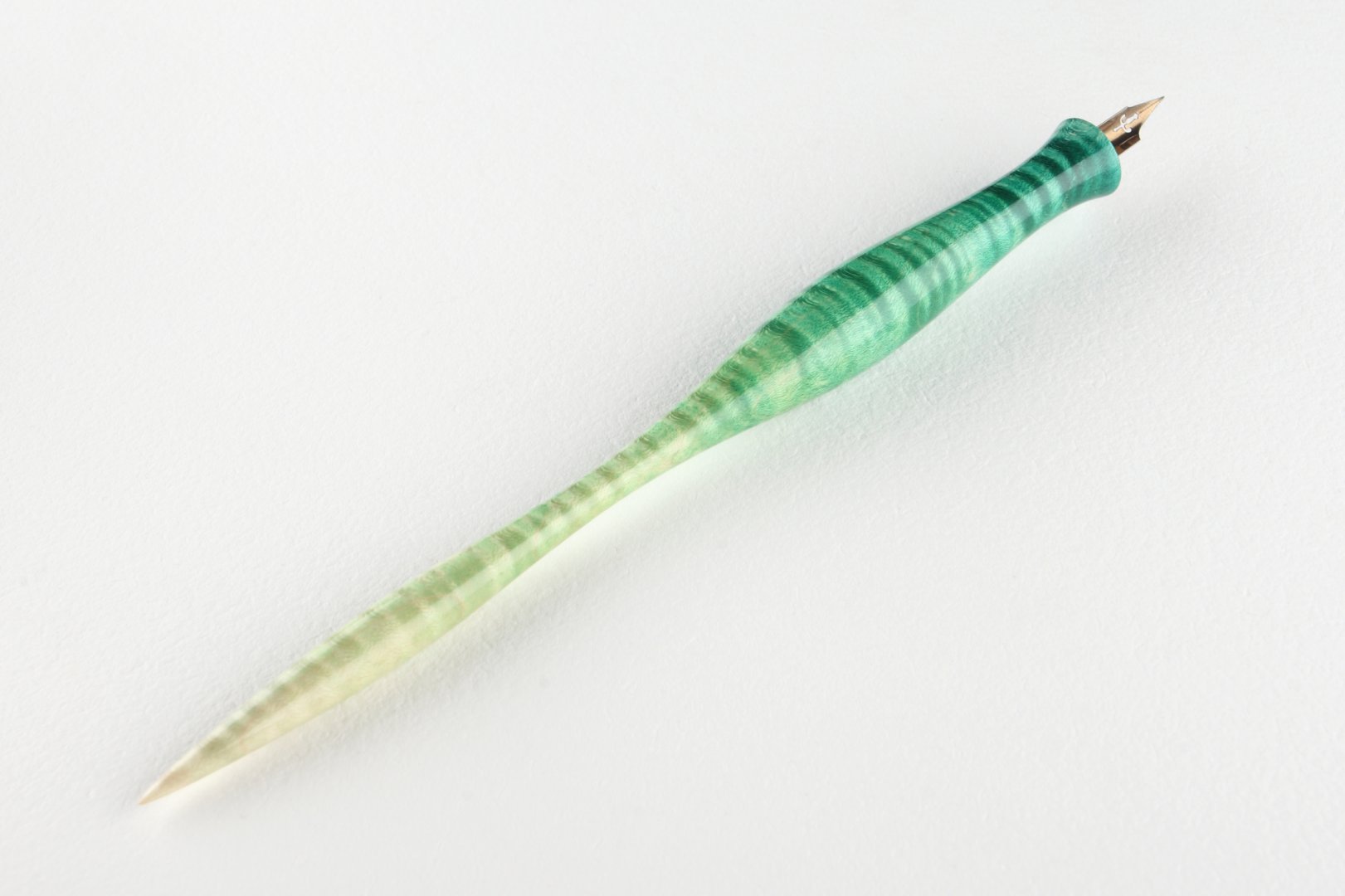 Straight pen holder made of dyed curly maple, finished with 10 layers clear coat polished to a high gloss. Equipped with a stainless steel ferrule.