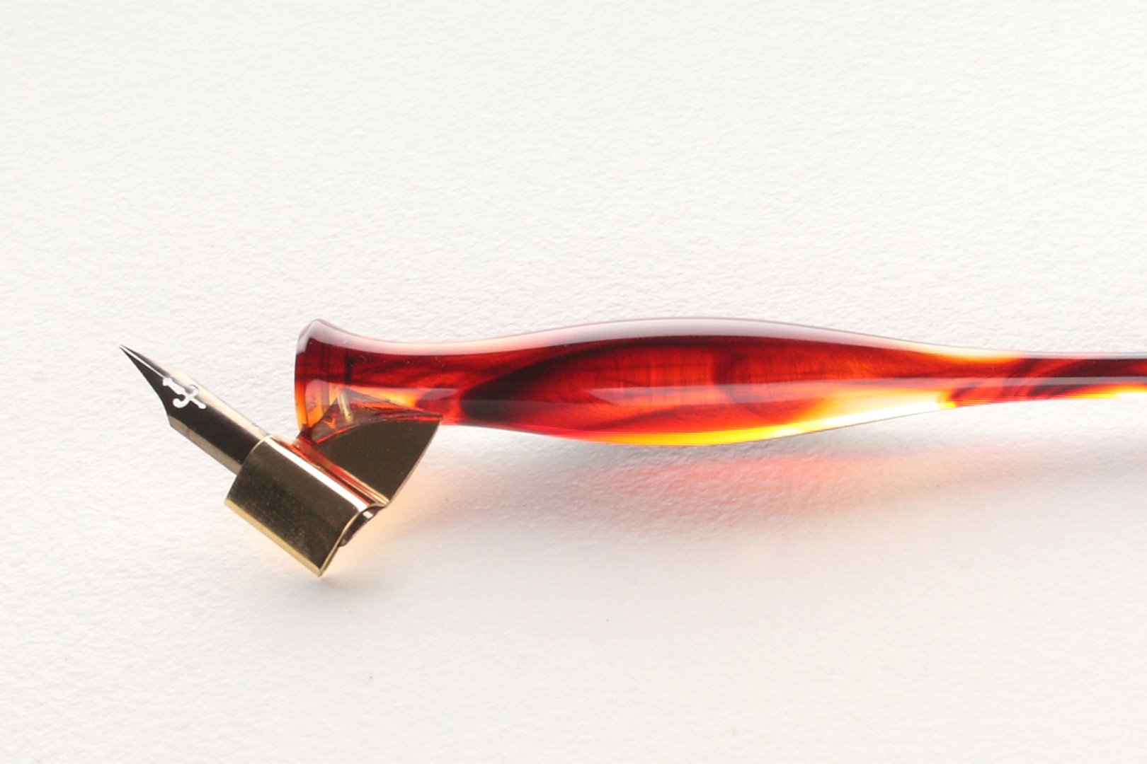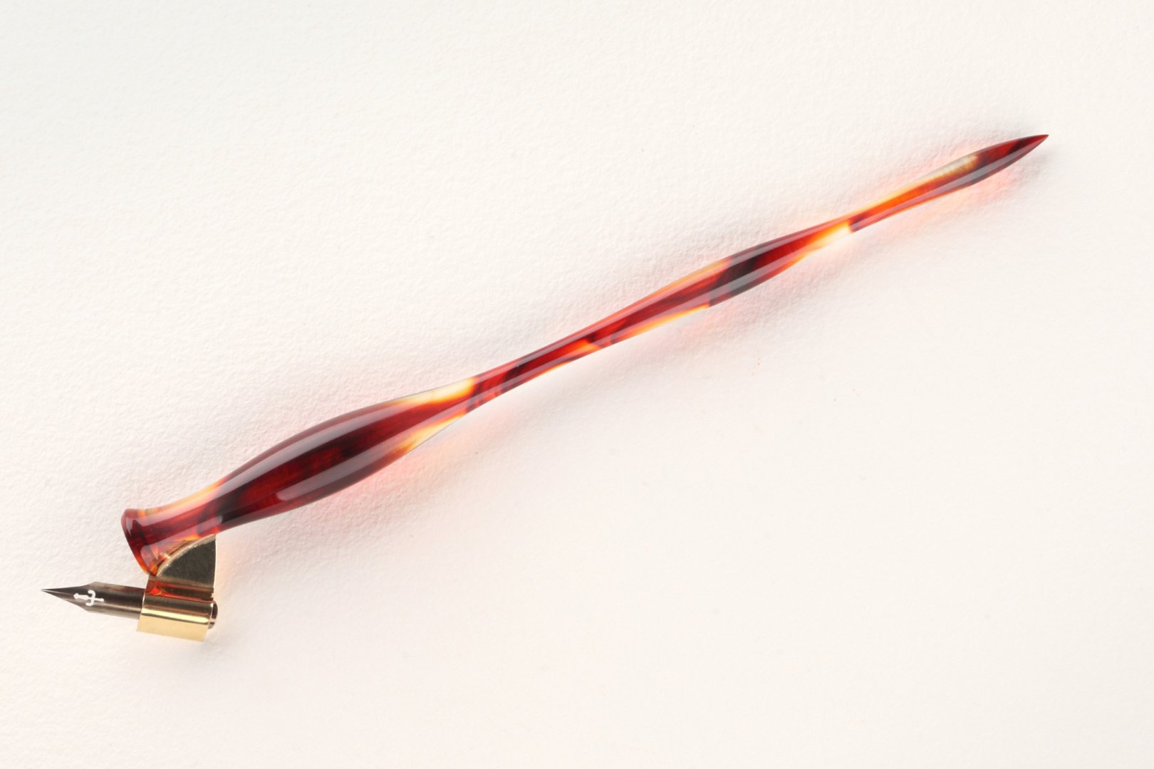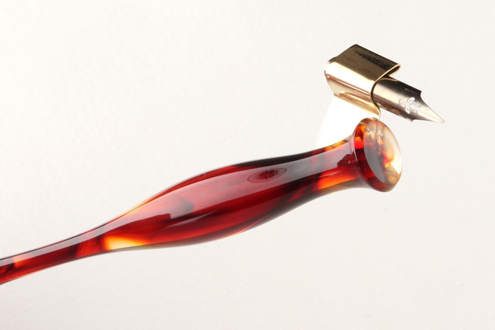 Pen holder made of 19th century french lucite in beautiful amber colour. Carefully polished to a high gloss, nib flange is made of brass.